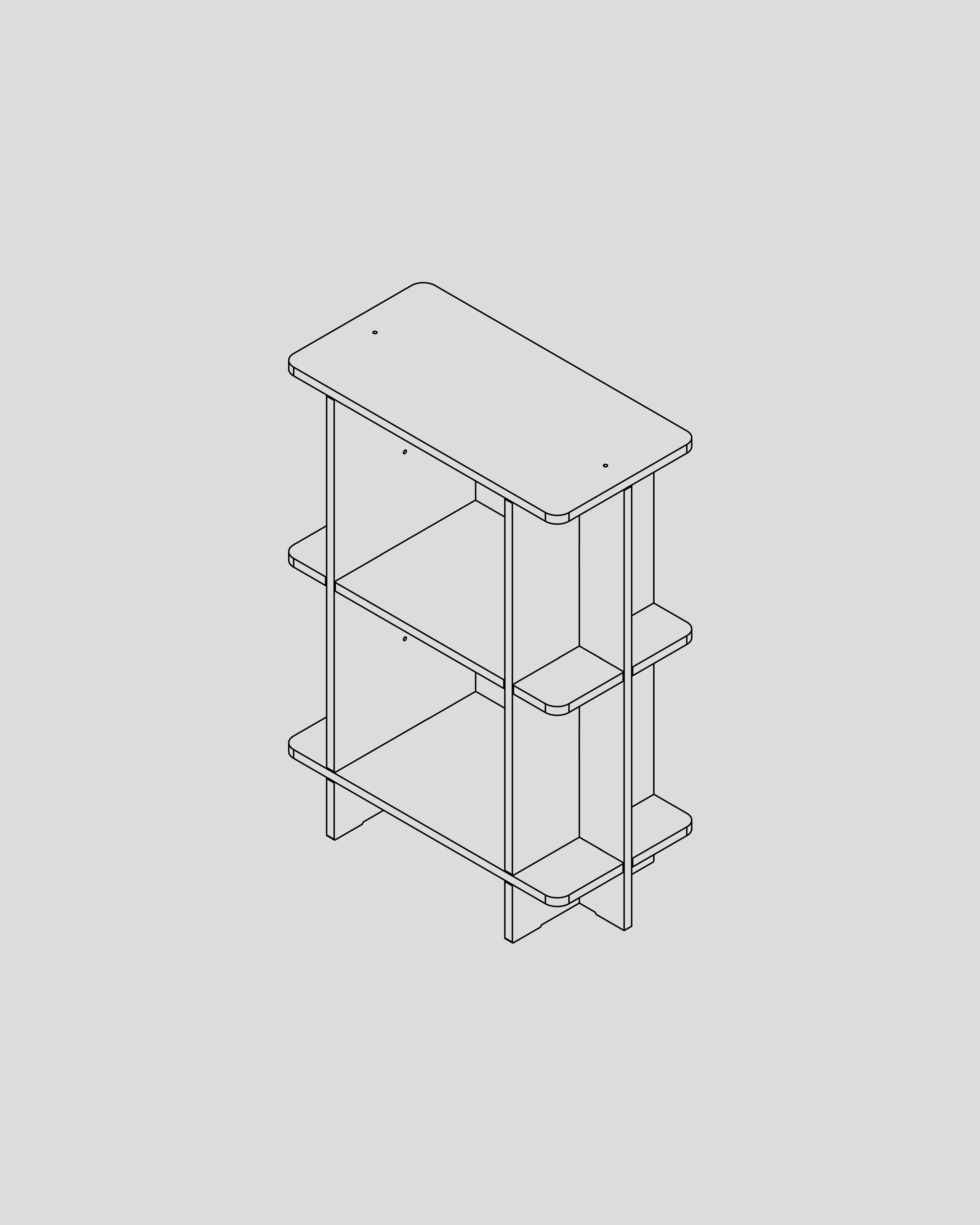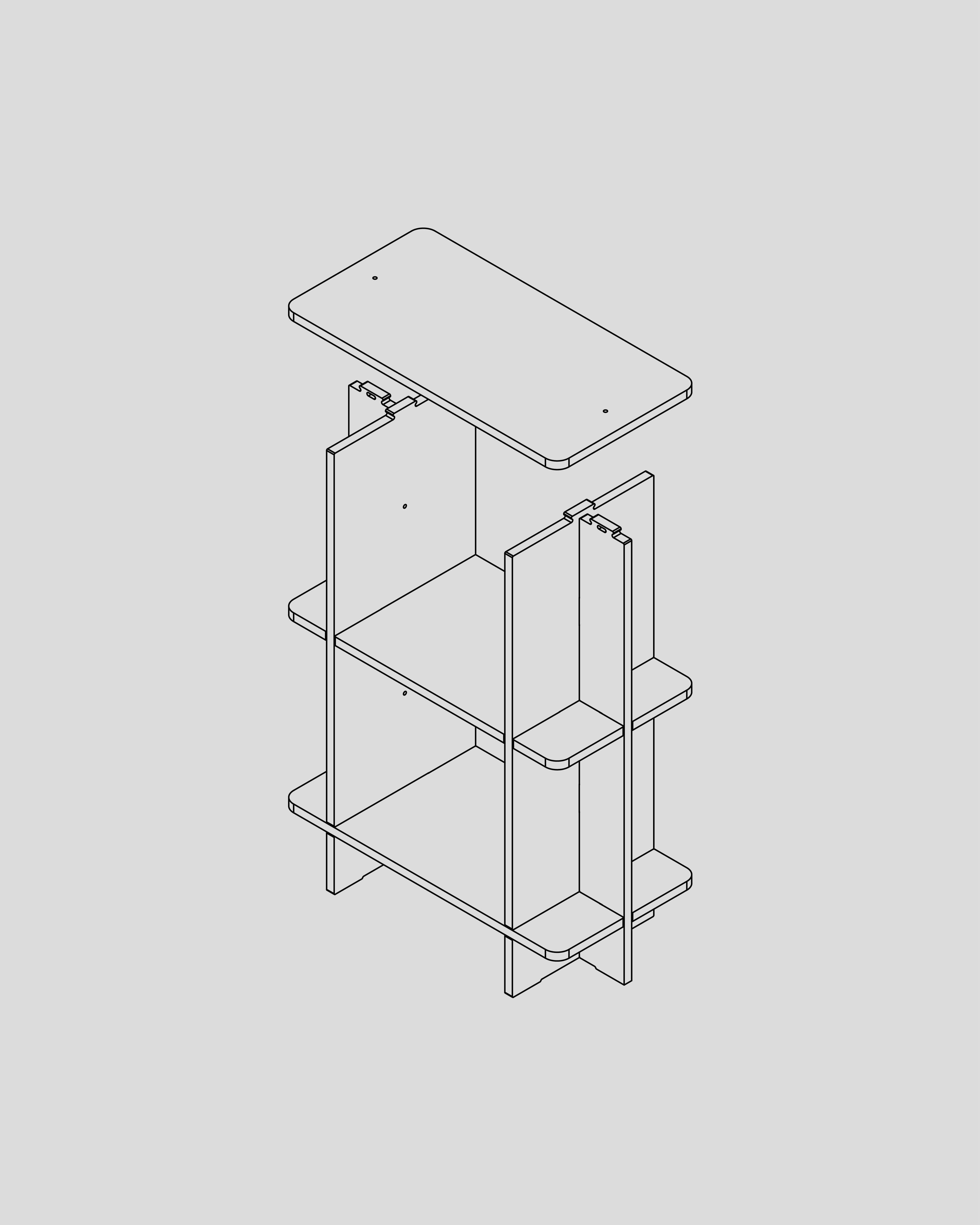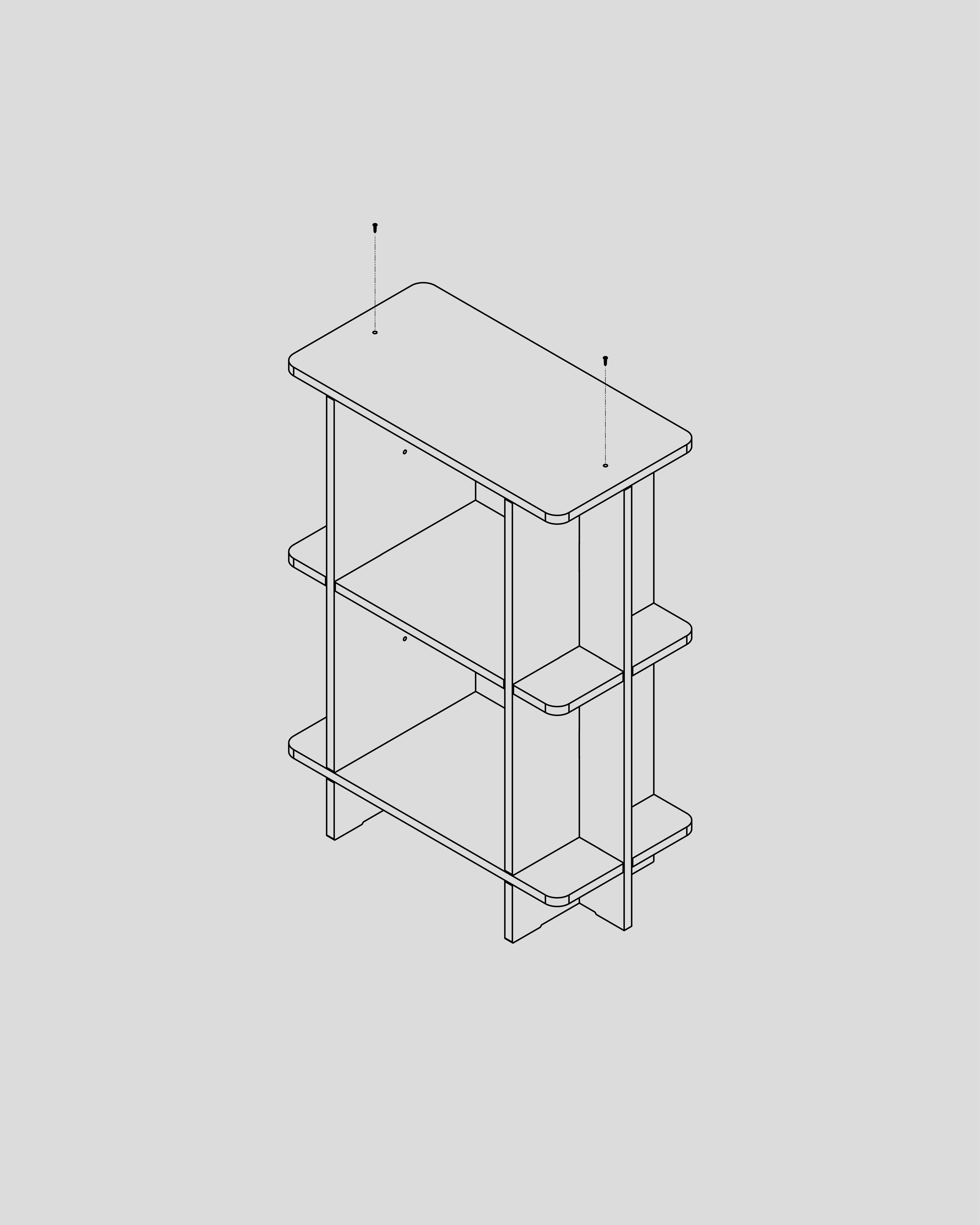 Set the shelf upright. Lower the top onto the legs and guide the tabs into their pockets. Take your time.