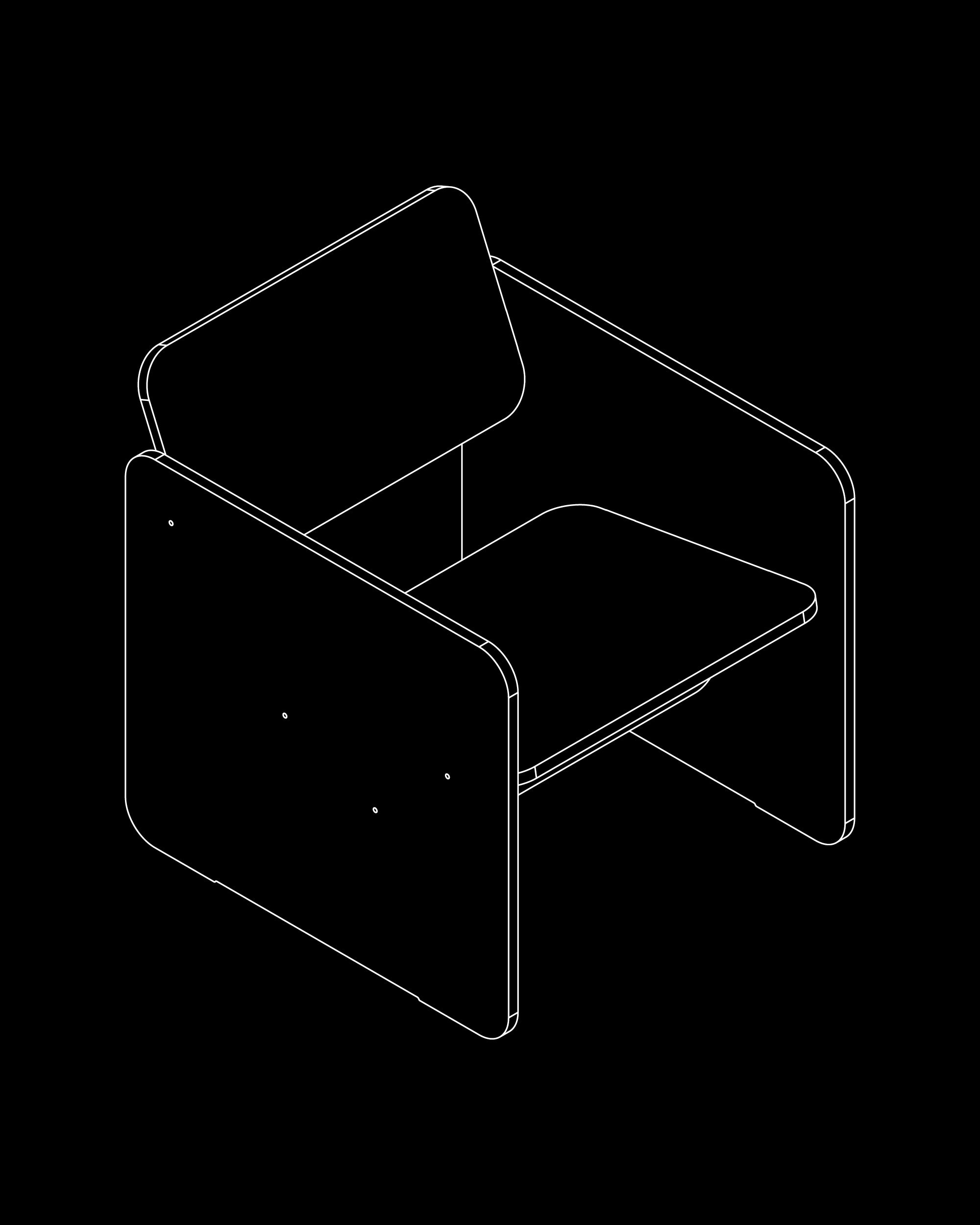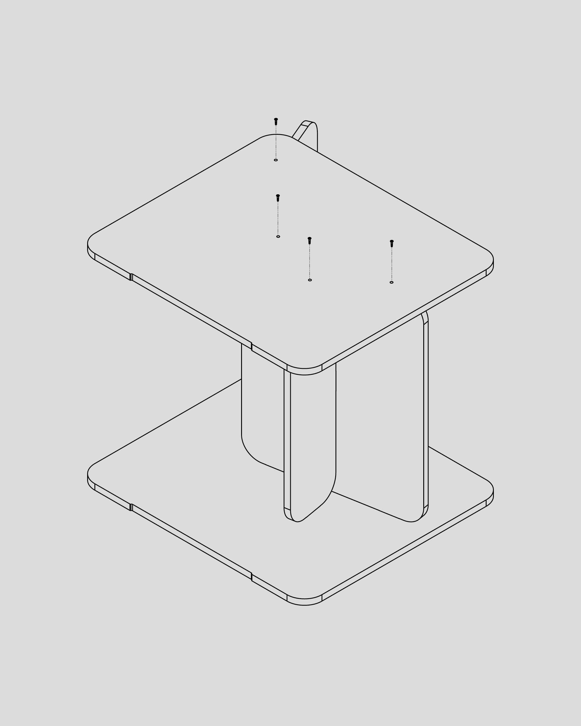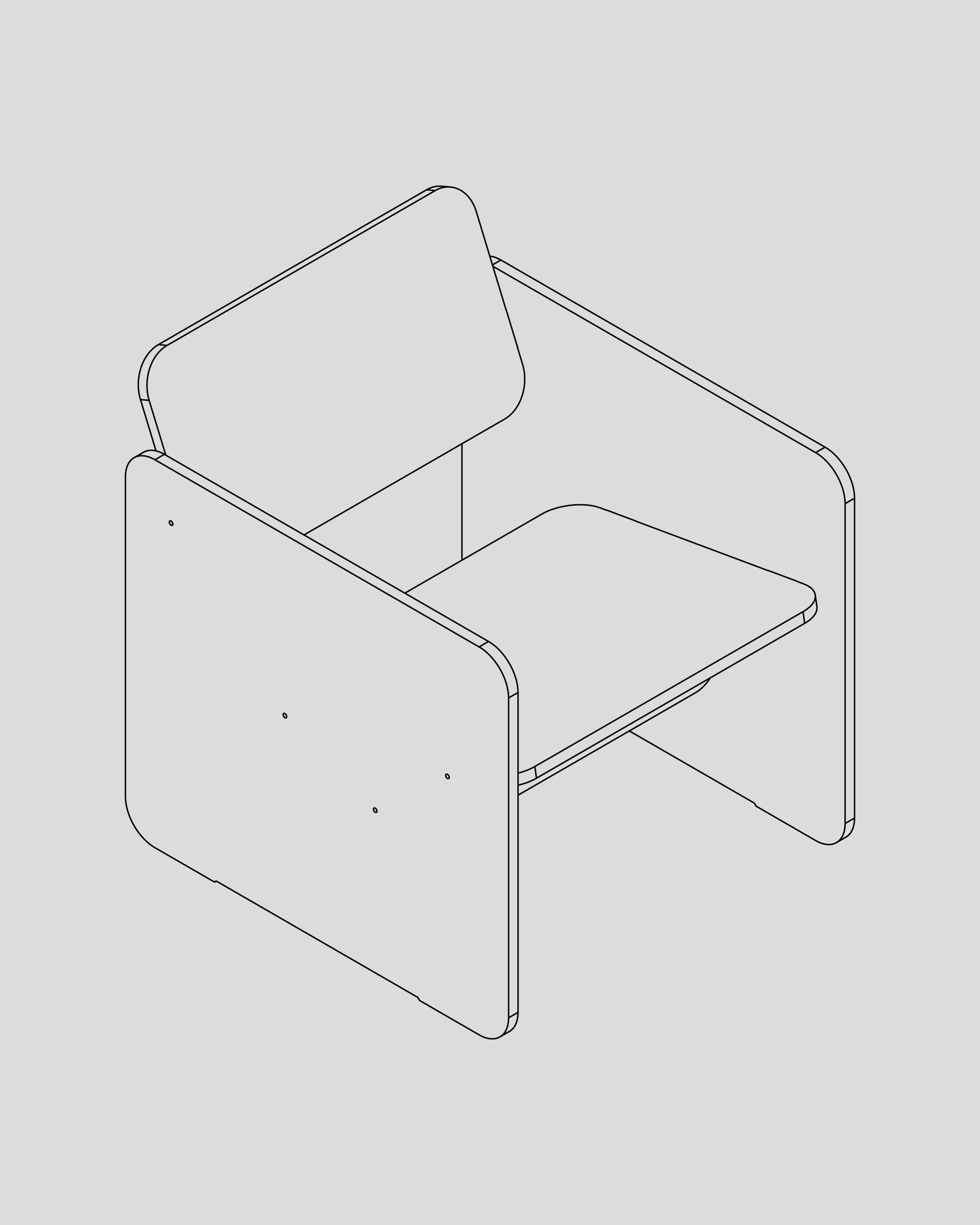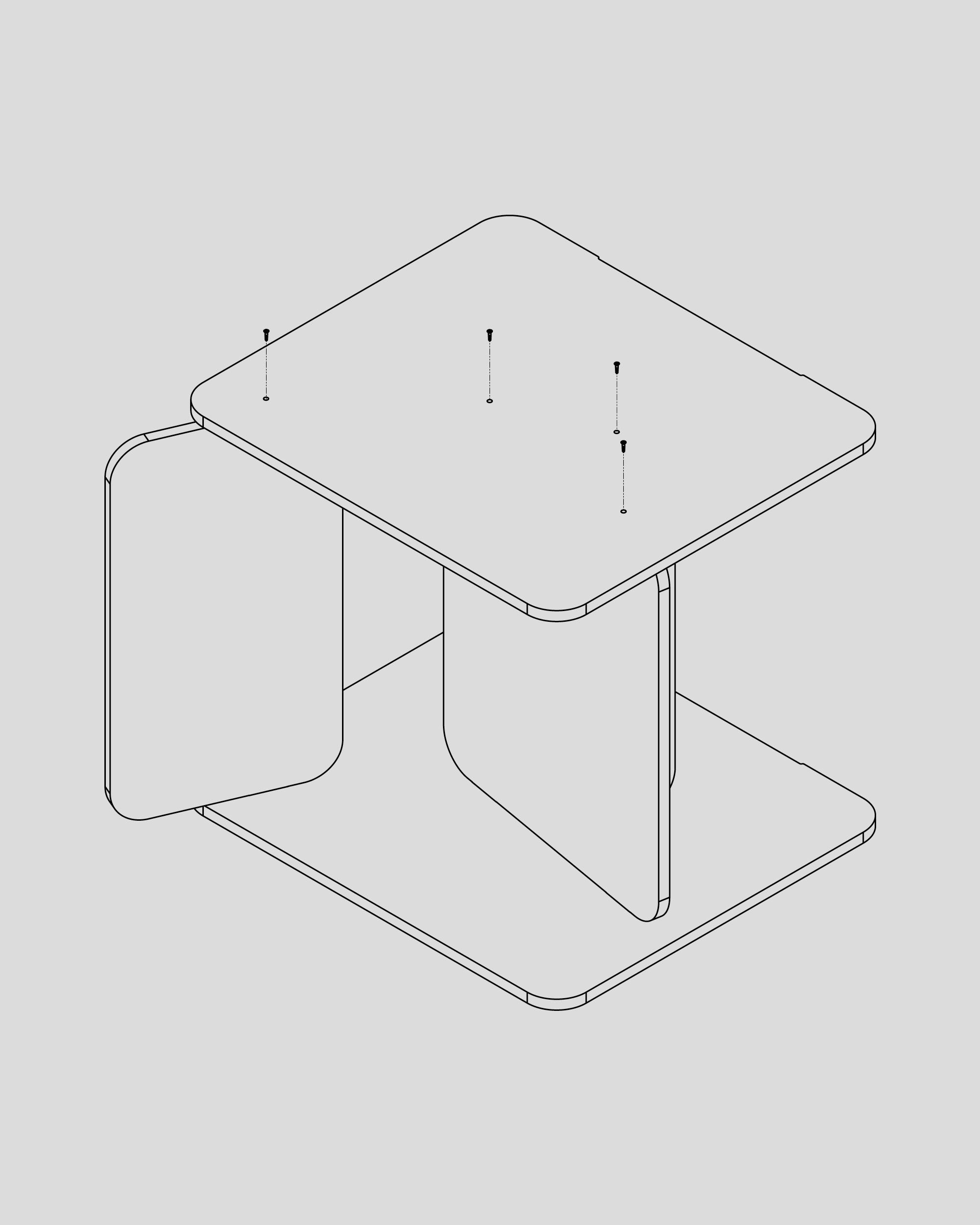 Using a non-electric flat-head screwdriver, drive in the four screws to secure the side piece. Stop when the head sits flush with the surface; avoid over-tightening. Carefully flip the chair over, ensuring the pieces remain securely in their pockets. You may need a helping hand.