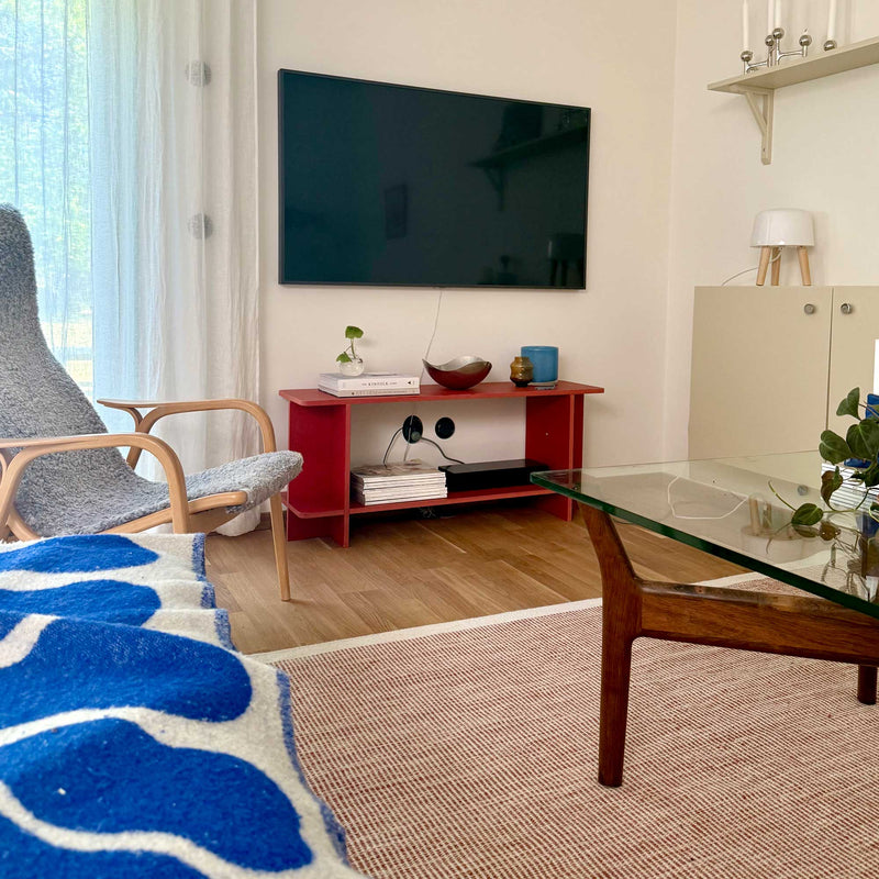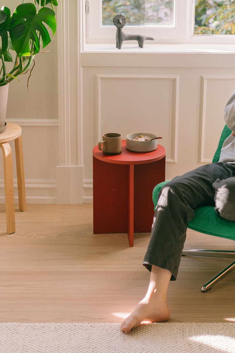 All our products are made from Valchromat. A premium sheet material produced in Portugal using recycled wood waste, such as chips and branches found on the forest floor. The fibres are dyed with organic colours and bonded with a non-toxic glue, giving the material a deep, consistent colour all the way through — not just on the surface.